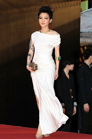 Karen: One of my favorite looks of the night belongs to Taiwanese actress Mavis Fan (范曉萱). Though she was also dressed in white, her platform heels, and edgy choice of accessories make it a winning combination in my book. And somehow, her tattoo just adds to the whole look.