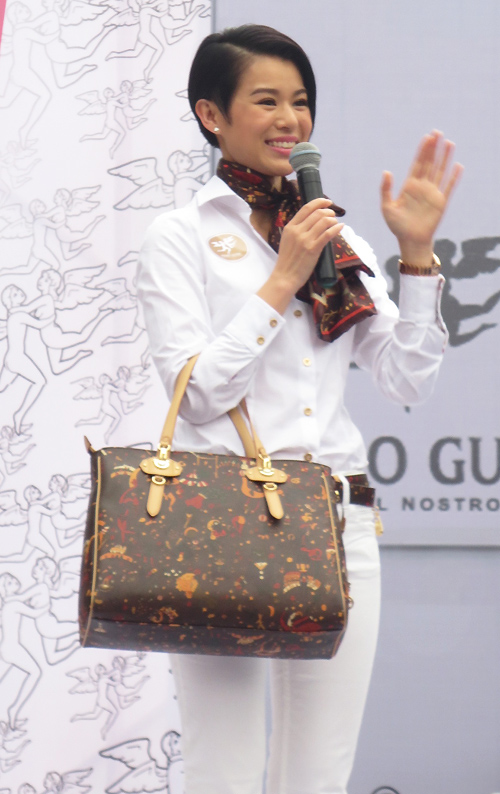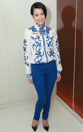 Myolie Wu (胡杏兒) has the perfect body shape to wear skinny jeans, which she is a big fan of and stocks in different colors. At two mainland Chinese events this week, Myolie resorted to the same blouse and skinny jean look. Minimalistic look and effort, which would look better on an older woman. In the right hand image, Myolie is promoting a Piero Guidi handbag.