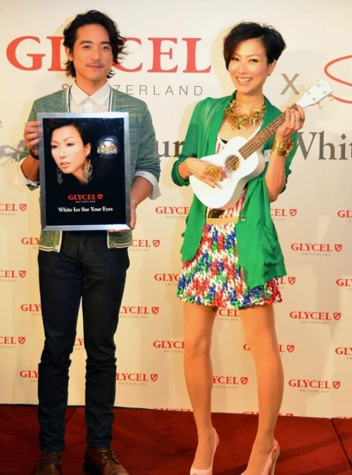 Good friends, Natalie Tong (唐詩詠) and Kenneth Ma (馬國明), wore matching yellows and smiles over their recent love rumors. Natalie looks feminine in a Patrizia Pepe dress from the Spring 2013 collection. The pale platform heels look thicker than her calves. The most impressive piece of the ensemble is hidden from view, as the magic undergarments Natalie wore left an eye-popping impression.