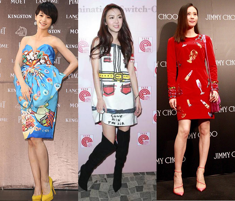 Cecilia Liu turned to another whimsical print showered with glasses of red wine at a recent Jimmy Choo store opening. Red wine on a red dress, paired with a hot pink purse and matching hot pink strappy heels? Not digging it.