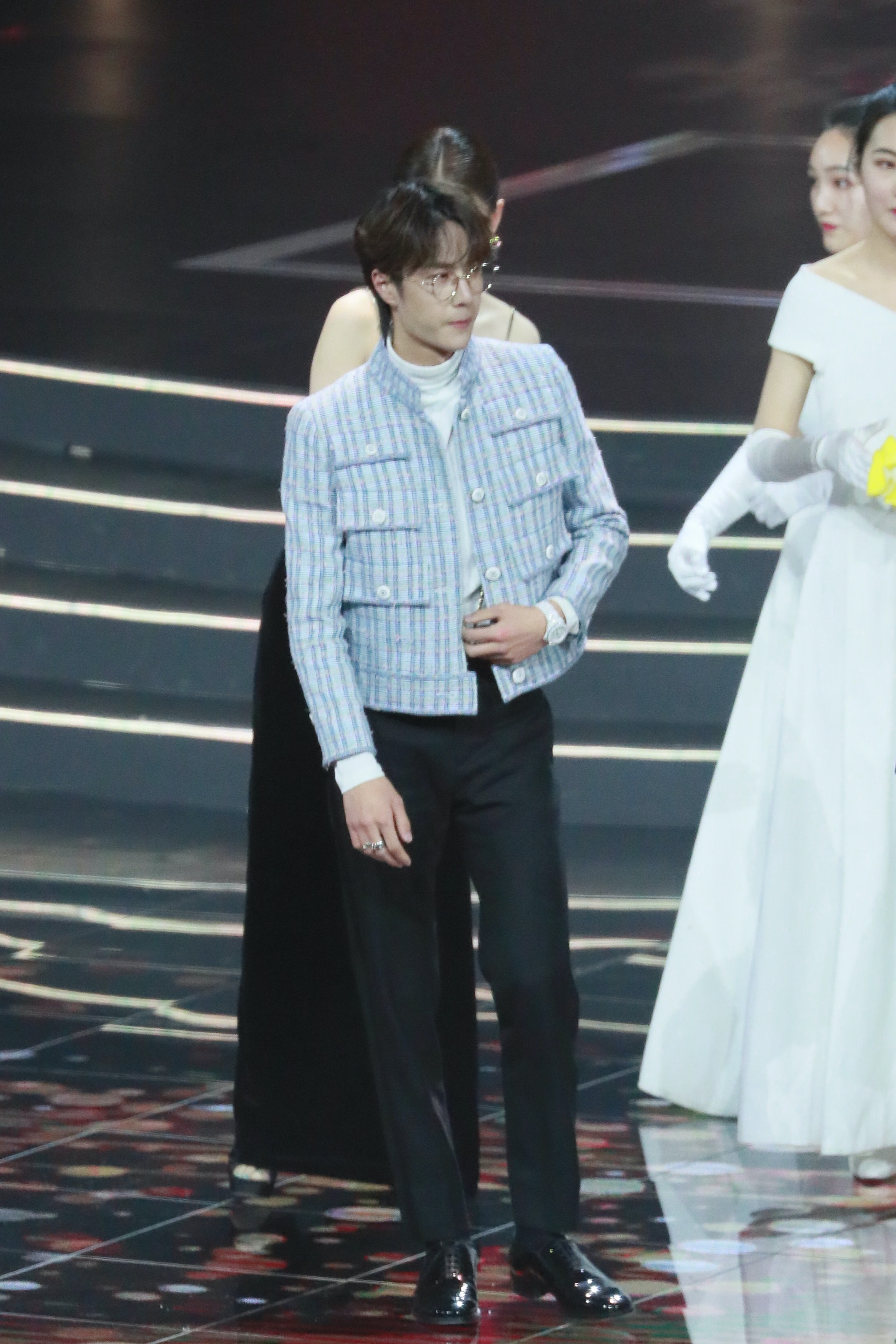 During a red carpet event recently, Yibo sported a blue tweed jacket from the Chanel 2021 spring/summer ready-to-wear series. Pairing the jacket with a white collared shirt and vintage beret, he appeared chic and stylish.