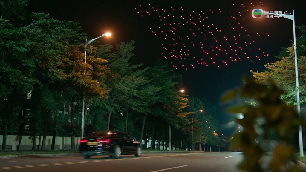 During the car chase between the two, Vincent managed to hack into a group of performing drones nearby, and used them to aim fireworks attacking Man Sir’s vehicle. Resembling the scene where Mystique used drones against Spiderman in the blockbuster Spiderman: Far From Home, TVB production attempted to entertain viewers with its localized twist.