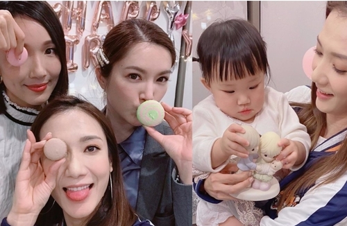 Good friends Grace Wong (王君馨) and Christine Kuo (苟芸慧) both attended the birthday party, and Christine brought homemade macarons. The ladies took photos with the treats as well as with the birthday girl, who looked adorable in pigtails.