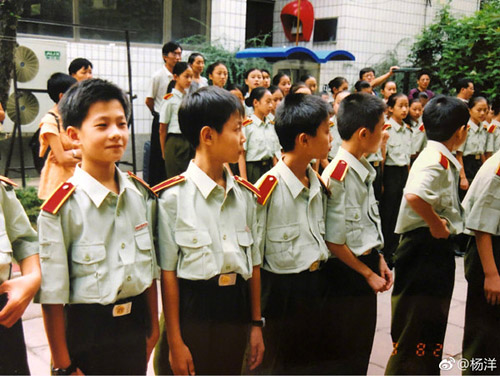 Yang Yang posted several photos of himself in a military uniform when he was a child, with the caption “Little Sheep” Standing orderly as part of a group of obedient students, the photo date was indicated as August 3, 2003. As a 12 year-old back then, “Little Sheep” already had many of his adult features but with an added aura of childish innocence.