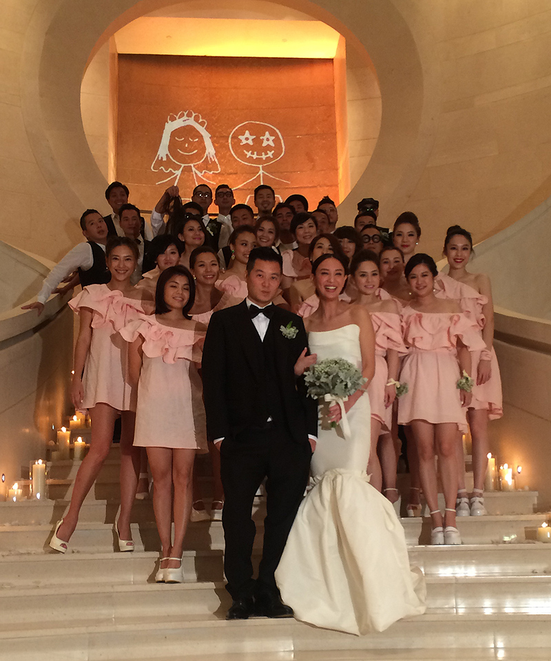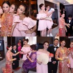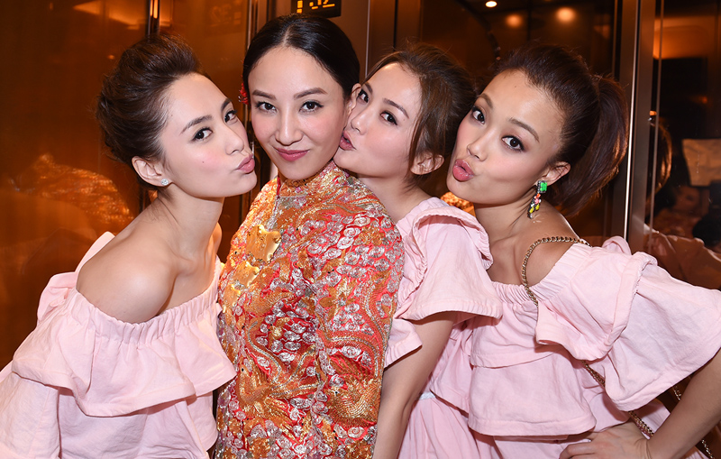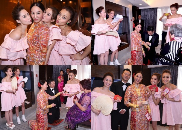 Joey Yung (容祖兒), Charlene Choi (蔡卓妍), and Gillian Chung (鍾欣潼), were Yumiko’s bridesmaids and wore matching pink dresses. Joey anchored the traditional tea ceremony for Yumiko in the morning. Joey said, “I especially went on the Internet to look for auspicious sayings during the tea pouring.”